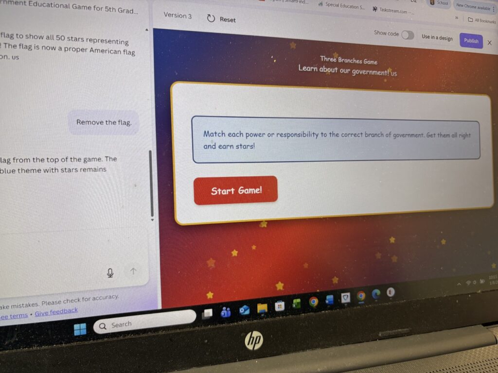 Through this project, students demonstrated their understanding of checks and balances, separation of powers, and key civics vocabulary—all while building collaboration, critical thinking, and digital design skills. The finished games allowed students to learn from one another by playing and explaining how the three branches of government work together.