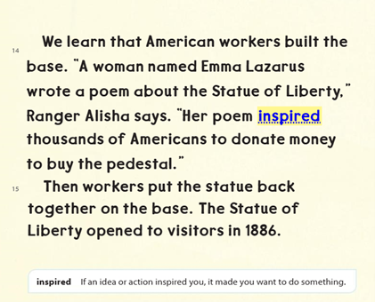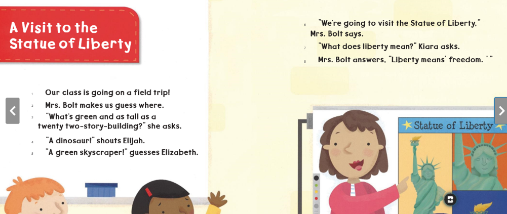 We explored headings to learn what each section would be about, looked closely at illustrations and photographs to picture important details, and read captions to learn more about what the images show. Students also spotted bold vocabulary words and used context clues and discussion to understand new words like symbol, immigrant, and freedom.